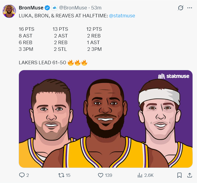 湖人三巨头上半场的发挥都不错,东契奇16分8助攻6篮板,詹姆斯13分2篮板2助攻2抢断,里夫斯12分2篮板1助攻,湖人也一度领先17分。